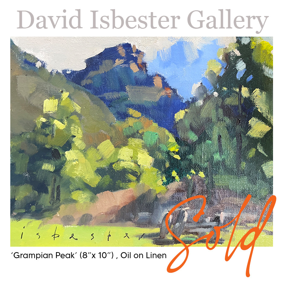 Description: Painted as a plein air demonstration at Grampians Brushes, this colourful impression captures the dramatic contrast of escarpment and forest, a direct response to the beautiful atmosphere of the landscape.