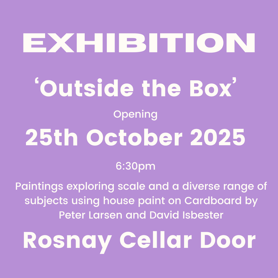 An exhibition of experimental paintings pushing both artists out of their comfort zones. Peter, a watercolour artist and David an oil painter take on the creative challenge of painting with house paint and brushes on packing cardboard. The resulting works are a surprise. Rosnay Cellar Door is the ideal creative space for us to show this exhibition. The venue is great, beautiful wine and you can't beat the atmosphere of their cellar door. I hope to see you there.