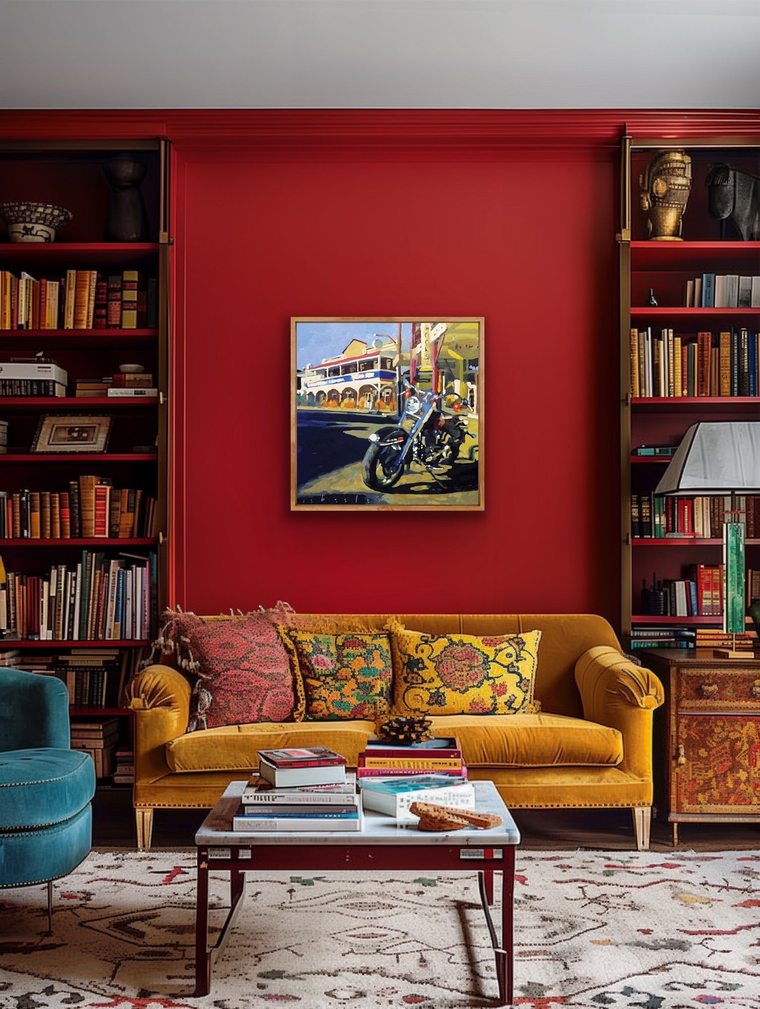 Broad, painterly brushstrokes describe light bouncing off chrome, shadows stretching across the footpath, and the timeless rhythm of a country main street. A study of sunlight, reflection, and the easy pace of rural Australia.